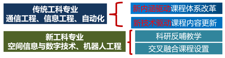 以“通识为根,专业为本,交叉创新”推进专业建设,围绕教学内容、课程体系、教学梯队和教学条件等专业基本要素,加强专业内涵建设,通信工程、信息工程、自动化三个专业获批为国家级一流本科专业建设点;对接行业区域经济社会发展需求,优化专业结构,新建“空间信息与数字技术”、“机器人工程”两个“新工科”专业,实现了学院新工科专业的合理布局。